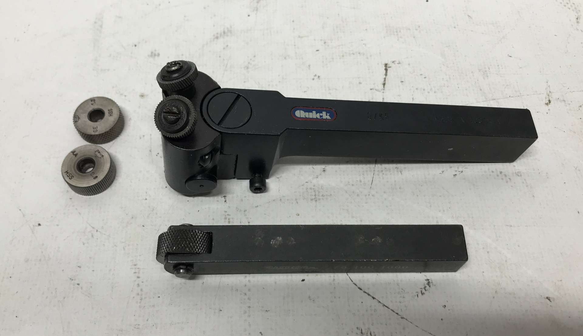 Gebruikte kartelhouders met wieltjes. -Merk: Quick. -1x Kruiskartelhouder 2wiels, ca 1 mm. -Type: P210-0200 O/KF. -1x Kartelhouder 1wiels, ca 1 mm. -Incl 2 extra wieltjes.