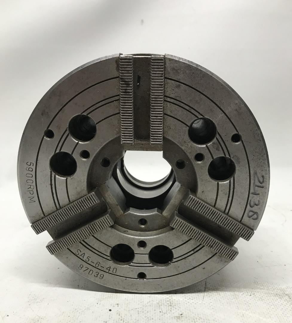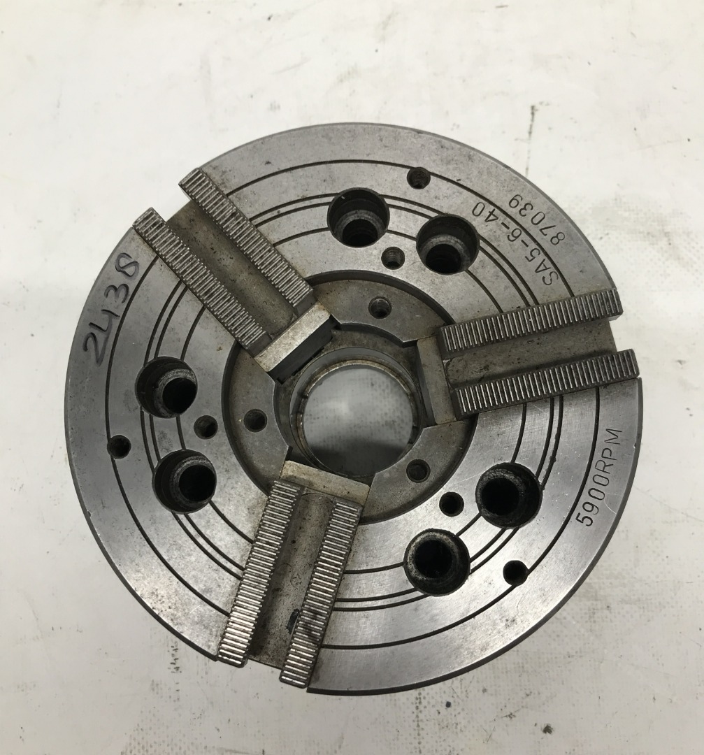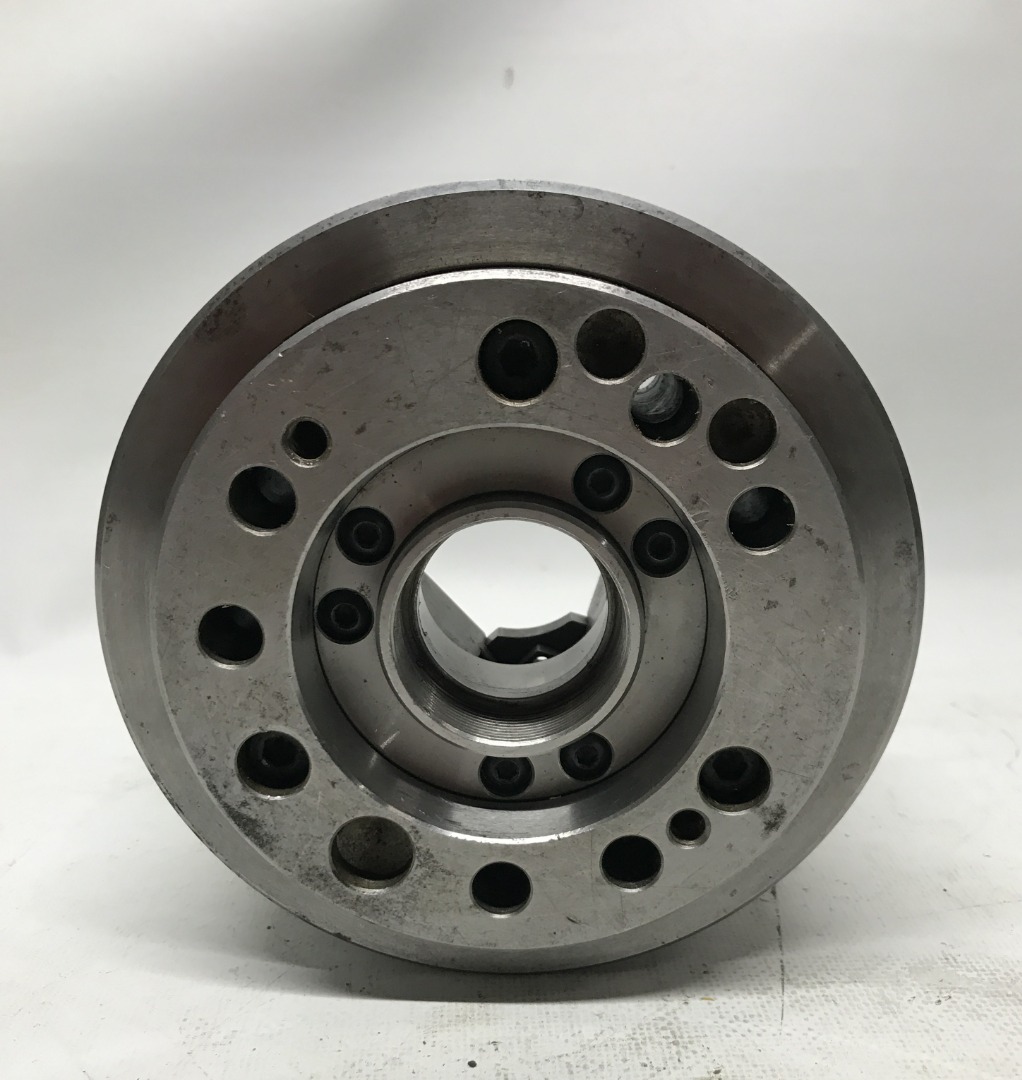 Gebruikte hydraulische 3 klauw. -Afm: Ø165 mm. -Dikte: 90 mm. -Doorlaat: 38 mm. -Zonder bekken. -Conus met max grootste maat 82 mm. -6 Potgaten. -Stc potgaten: 105 mm.