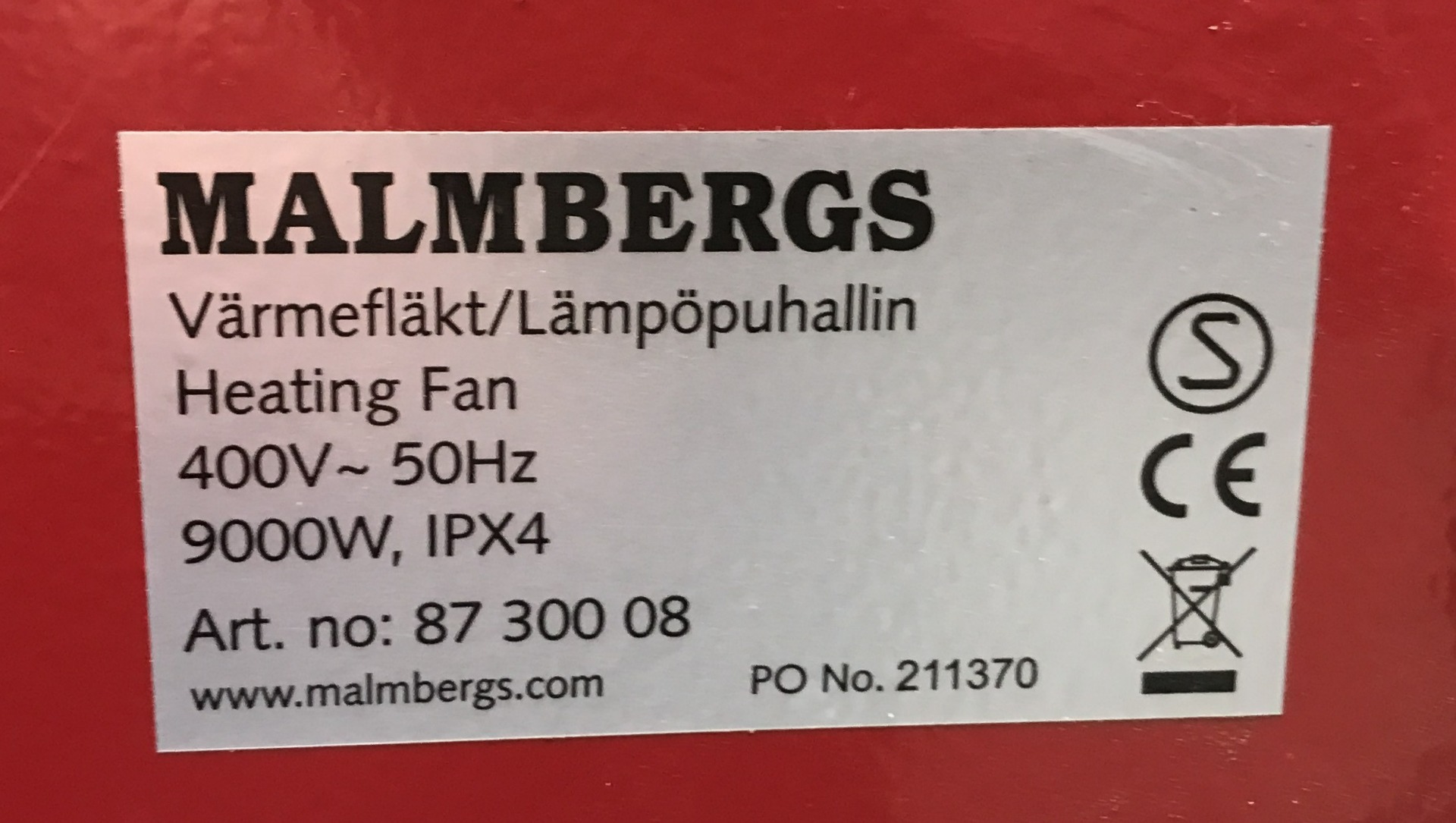 Elektrische fan heater, Malmbergs, Bygg-Ström, 400 volt, 9kW