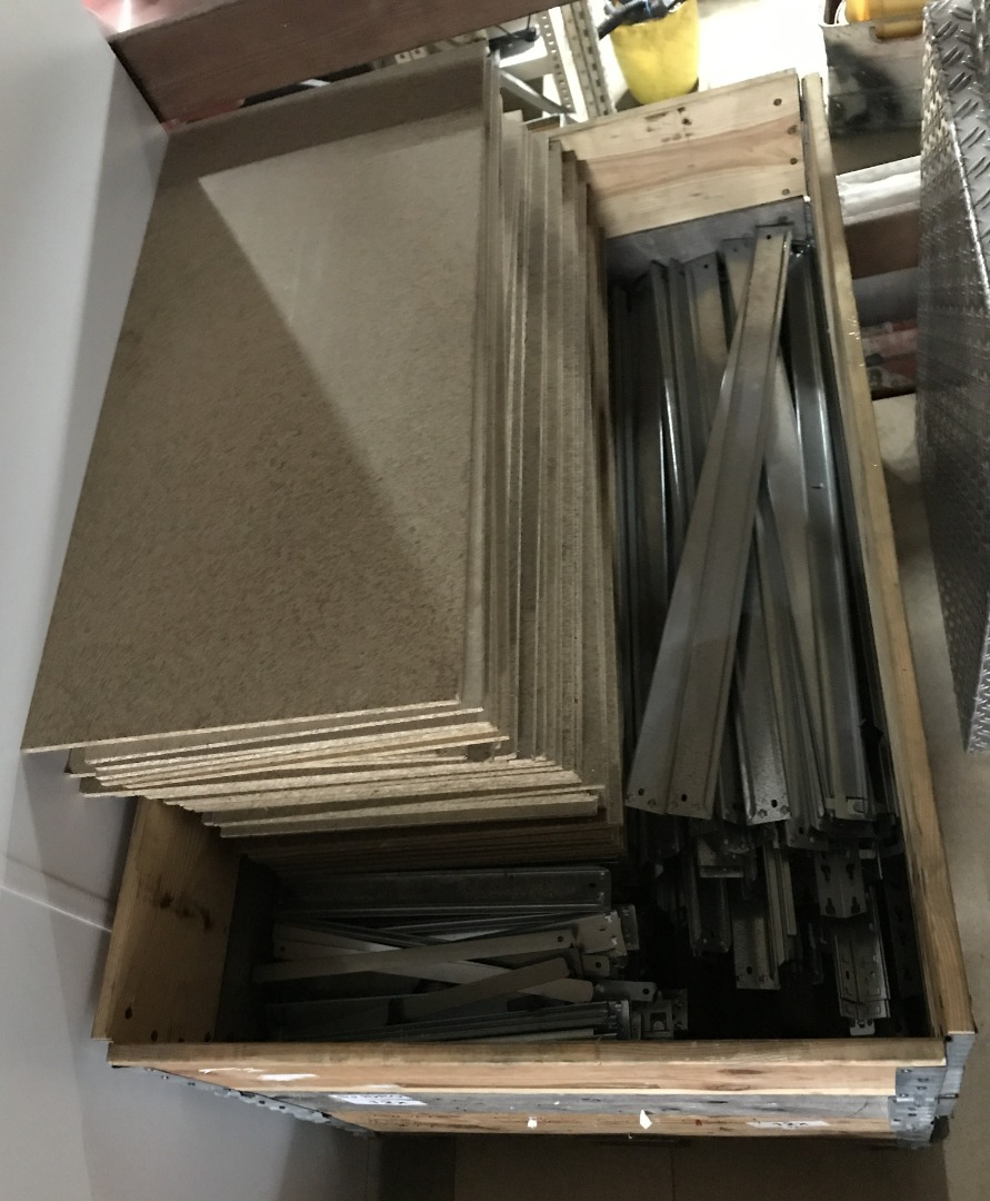 Gebruikte legbordstelling. -Afm: ca 94b x 45d x 98h cm. -Materiaal: staal gegalvaniseerd met houten legbord. -Beschikbaar: ca 90 legborden met profielen.